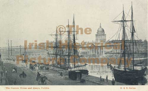 The Custom House and Quays, showing Tea Clippers from America, Dublin, Ireland. old Irish photograph. QF-00128